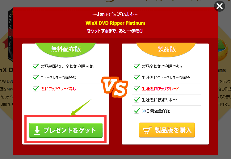 3. ポップアップ画面上に、「プレゼントをゲット」のボタンをクリックすると、プログラム本体とライセンスコードが入ったzipファイルのダウンロードが始まります。